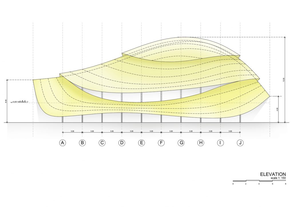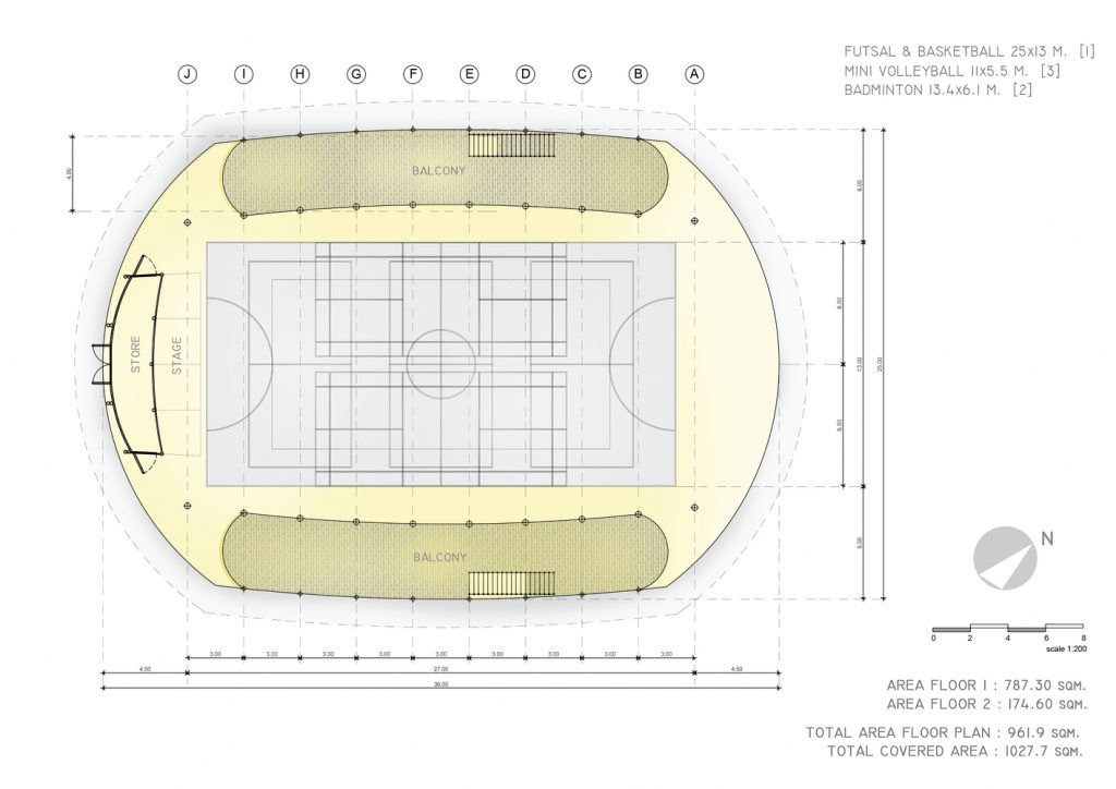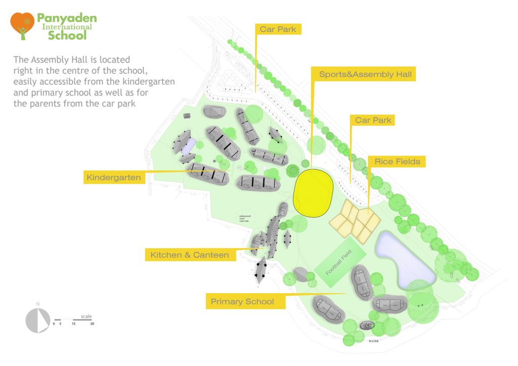The brief was to build a hall that should be big enough to hold the projected capacity of 300 students, but still smoothly integrates with the previous earthen and bamboo buildings of the school as well as the natural hilly landscape of the area. It should provide modern sports facilities and use only bamboo to maintain the low carbon footprint and the “Green School” mission of Panyaden.