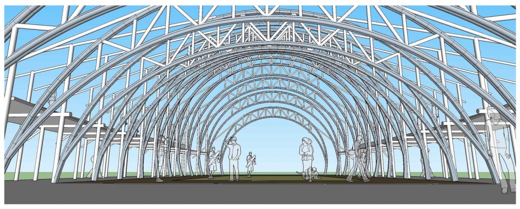 The hall was designed with the help of 2 independent engineers to modern safety standards of loads, shear forces etc. to withstand the local high-speed winds, earthquakes and all other natural forces. The innovative structural design is based on newly developed prefabricated bamboo trusses with a span of over 17 meters without steel reinforcements or connections. These trusses were prebuilt on site and lifted into position with the help of a crane.